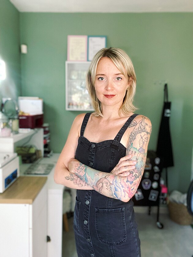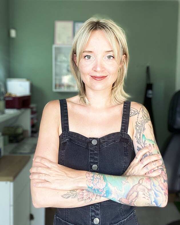 Šest včetně větších motivů. Na první pohled nepůsobím jako klasický tatér – jsem jemná blondýna, nemám tetování na obličeji ani příliš piercingů. Ale osobní zkušenost je důležitá – klienti vidí, že vím, jaké to je sedět na druhé straně. A pro mě je to pořád hlavně umění, které má smysl.