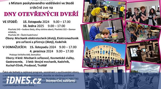 SOU Domažlice nabízí učební obory jak v Domažlicích, tak i ve Stodě. V každém městě pak vyhlásilo rovnou dva termíny Dnů otevřených dveří. V Domažlicích i ve Stodě se prostory obou škol letos poprvé otevřou široké veřejnosti už 15. listopadu v 9 hodin. V Domažlicích bude druhé otevření ještě v tomto roce, a to konkrétně 4. prosince, rovněž od 9 hodin. Ve Stodě pak počítejte s druhým termínem až po novém roce, 16. ledna 2025.