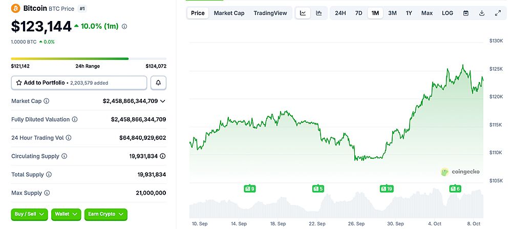 Bitcoin si během posledního měsíce připsal více než 12 % a dosáhl nového historického maxima nad hranicí 126 000 USD. Jeho tržní kapitalizace tak překonala 2,5 bilionu USD a zařadila kryptoměnu mezi sedm nejcennějších aktiv světa. K růstu přispěla očekávání snížení úrokových sazeb FEDu, příznivější regulační nálada v USA a sílící institucionální zájem podpořený přílivem miliard dolarů do bitcoinových ETF.