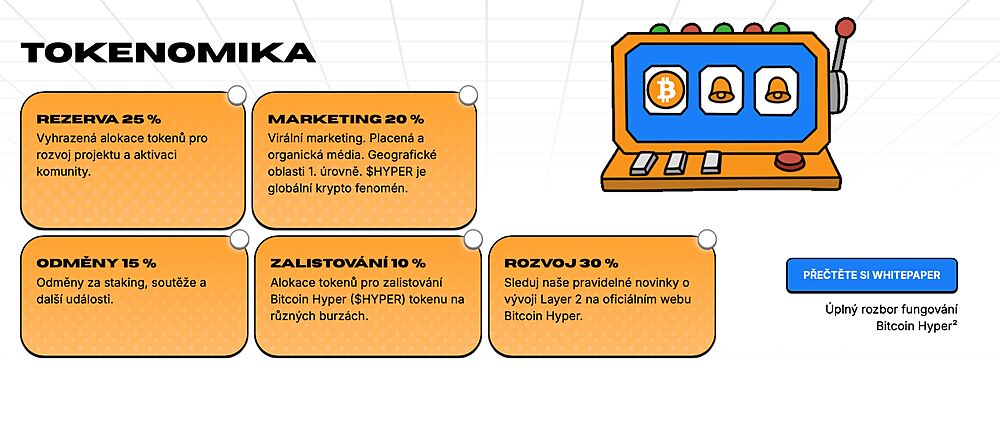 Nativní token $HYPER má maximální nabídku 21 miliard tokenů. Z této sumy jde 30 % na vývoj platformy, 25 % do pokladnice projektu a 20 % na marketing. Na staking a komunitní odměny připadá 15 %, přičemž staking aktuálně nabízí APY ve výši 51 %. Zbývajících 10 % je určeno pro zalistování tokenu na kryptoměnových burzách.