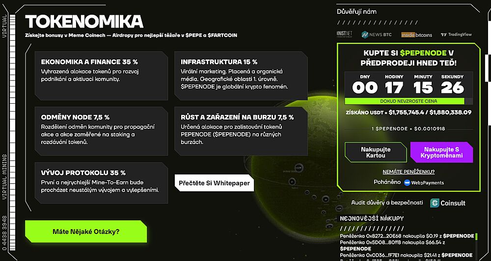 Nativní token $PEPENODE má celkovou nabídku 210 miliard tokenů. Z této částky je 35 % vyhrazeno na rozvoj komunity, dalších 35 % na vývoj protokolu a 15 % na marketing. Po 7,5 % připadá na komunitní odměny a na burzovní likviditu. Projekt navíc zavádí deflační model – 70 % všech tokenů utracených za nákup či upgrady Miner Nodes se automaticky spálí, čímž se snižuje nabídka a roste jejich vzácnost.