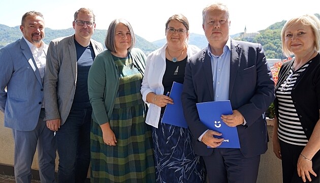 Zleva: Vedoucí odboru zdravotnictví Petr Severa, radní pro oblast zdravotnictví Radim Laibl, vedoucí ekonomicko-administrativního úseku Hospicu sv. Štěpána Šárka Bezchlebová, ředitelka hospicu Monika Marková, hejtman Richard Brabec, zdravotní sestra Jana Bezděková