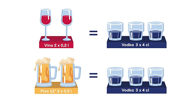 Tomu odpovídají i obvyklé porce. Piva si dáme půllitr, vína dvě deci a lihoviny velký panák, tedy 40 mililitrů. Když se přepočítá obsah alkoholu, realita vypadá jinak, než si většina lidí myslí. Půllitr desítky obsahuje přibližně 16 gramů čistého alkoholu, dvoudecová sklenka vína zhruba 19 gramů a panák vodky o objemu 4 cl asi 13 gramů etanolu. Nejvíce alkoholu je tedy v typické porci vína, na druhém místě je půllitr piva a až třetí je panák lihoviny