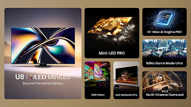 Hisense U8Q je televizor, který posouvá hranice toho, co lze od moderního zobrazení očekávat. Nabízí nejlepší obrazovou technologii, dokonalý zvuk, vynikající podporu pro hraní her a chytré funkce, které zlepšují každodenní uživatelský komfort. Pokud hledáte TV, která spojuje inovace, ekologickou odpovědnost a dokonalý audiovizuální zážitek, Hisense U8Q je jednoznačnou volbou pro rok 2025.