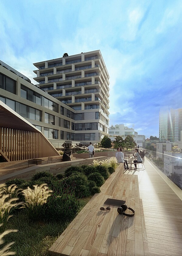 Pohled na multifunkční objekt Hila, s plně vybavenými byty k pronájmu v nejvyšších patrech objektu s lodžiemi i střešní terasou