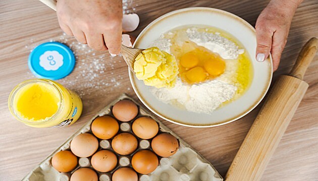 Ghee však využijete v kuchyni nejen pod vajíčka. Čistý máselný tuk pod modrým víčkem otevírejte kdykoliv, kdy to v kuchyni plánujete rozpálit. Ghee je báječné na smažení, přípravu základů polévek a omáček, také na pečení, grilování i polévání horkých knedlíků. Ghee využijete ve sladké i slané kuchyni.